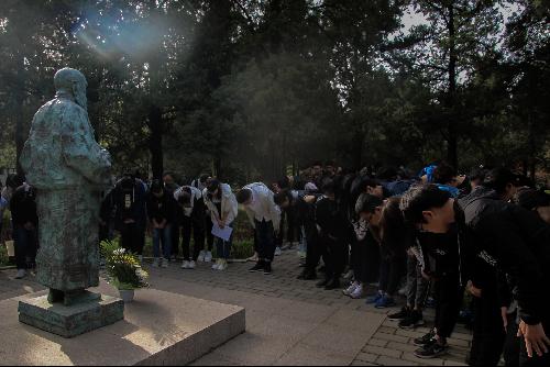 日暖风熏,翠柏凝春。在学校先贤于右任、辛树帜、沙玉清、石声汉、周尧的雕像前,学生们怀着沉重的心情进献鲜花,鞠躬致敬以表达内心的深深哀思。学生代表霍潇慷慨激昂地介绍了学校的创建历史以及于右任等一代代西农人为改善国家农业发展和教育而做出的辛勤努力。党员代表胡可欣深情地回顾了于右任、辛树帜、赵洪章、李振岐、周尧等老一辈先贤扎根杨凌,建设西北的奋斗史。