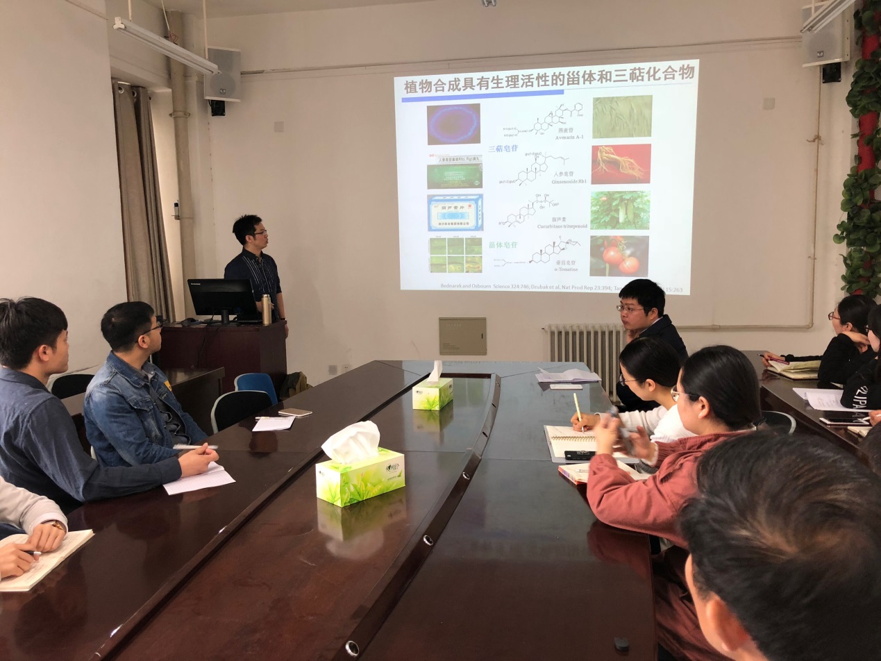 4月10日上午,薛哲勇副研究员为学院师生作了题为“三萜代谢多样性的功能及分子机制研究”的学术报告。报告主要介绍了其多年来在水稻三萜代谢途径以及代谢多样性产生的分子机制方面取得的科研进展。会后,学院董娟娥教授和麻鹏达副教授邀请薛哲勇参观了其科研实验室,并就植物次生代谢研究领域的热点问题展开了深入交流与讨论,初步达成了合作意向。