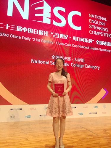 4月中旬,第二十三届中国日报社“21世纪 •可口可乐杯”全国英语演讲比赛总决赛在杭州师范大学举行。永利官网选手彭钰琛凭借扎实的语言功底、纯正的美式英语、出色的应变能力、敏捷的思维和激情洋溢的表现,获得全国总决赛二等奖,指导教师张晓容副教授获优秀指导教师称号。这是近年来我校外语学科竞赛取得的最好成绩。