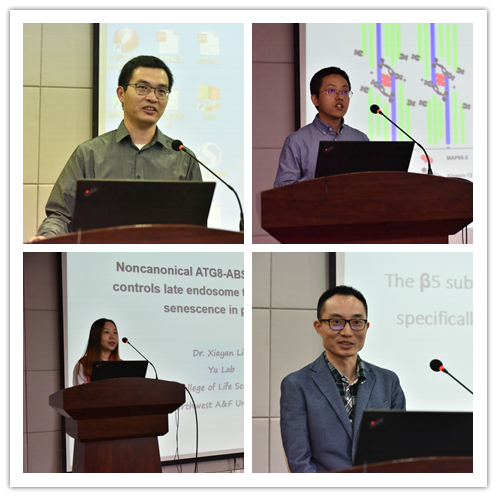 邓麟博士和韩佳嘉博士分别作了题为“Cell cycle regulation and genome maintenance”和“The β5 subunit is essential for intact 26S proteasome assembly to specifically promote plant autotrophic growth under salt stress”的学术报告。邓麟博士利用裂殖酵母作为模式系统研究了细胞分裂调控的机制,这为理解癌细胞中细胞分裂失调的原因以及寻找新的抑癌靶点奠定了基础。韩佳嘉博士主要通过研究26S蛋白酶体途径参与植物幼苗对盐胁迫的响应作用机理,阐明了26S蛋白酶体途径和植物胁迫响应关键激素脱落酸途径的互作关系。此外,学院青年教师王存教授、张宏昌副教授、刘夏燕副教授也分别就各自的最新研究成果作了精彩的学术报告。