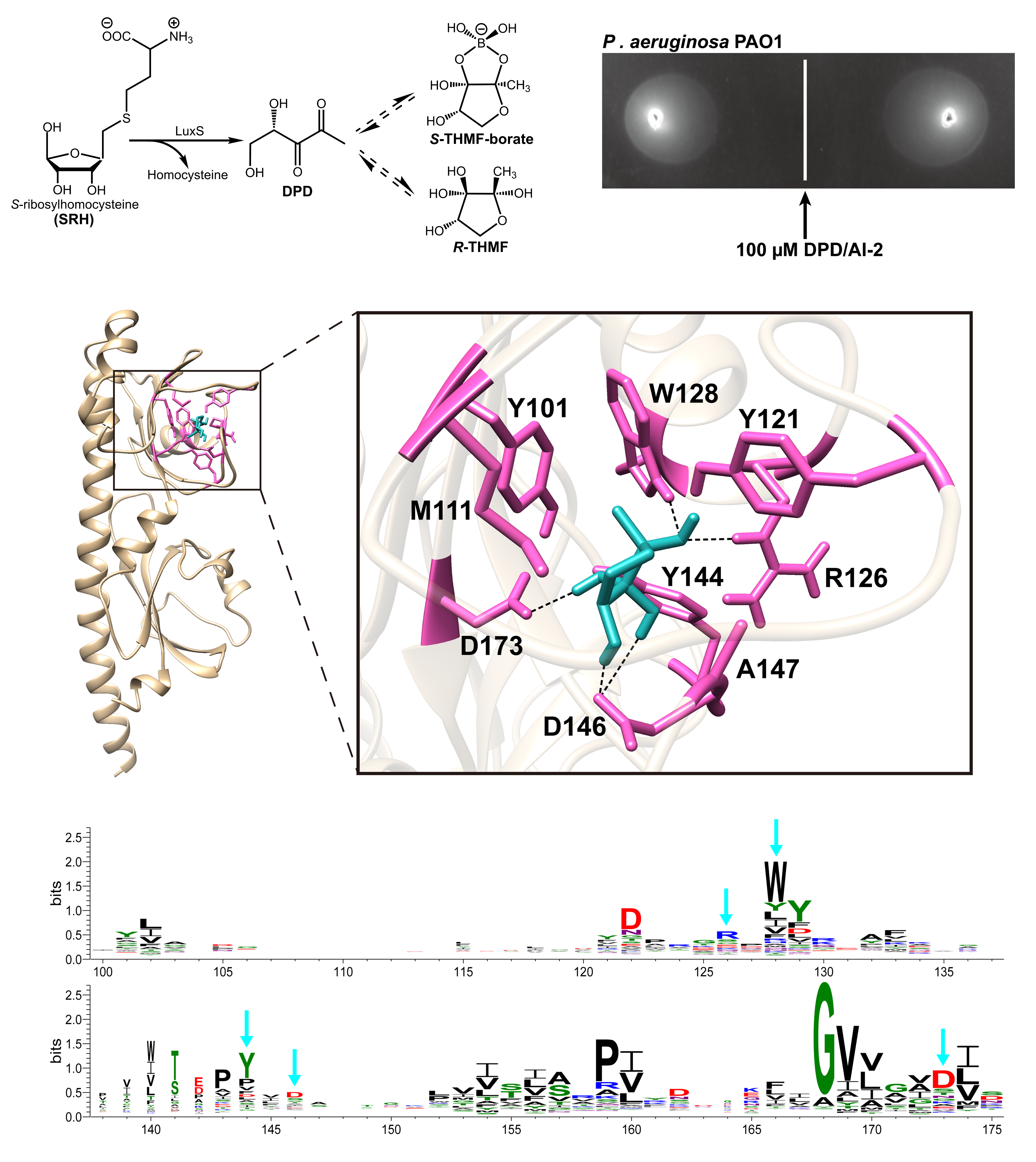 该研究首先发现条件性致病菌铜绿假单胞菌(Pseudomonasaeruginosa)对AI-2信号表现出明显的正趋向性,随后以此表型入手构建趋化蛋白编码基因突变体文库并筛选获得介导AI-2趋向性的两个跨膜甲基化趋化受体基因pctA和tlpQ。分子互作实验及对接模拟分析揭示AI-2信号分子能以高亲和力结合受体蛋白PctA和TlpQ的周质dCACHE结构域。随后研究人员进一步发现包括甲基化趋化受体、组氨酸激酶、c-di-GMP合成与水解酶、丝氨酸磷酸酶、丝氨酸/苏氨酸蛋白激酶、腺苷酸/鸟苷酸环化酶在内的众多原核生物跨膜信号转导蛋白均可通过胞外dCACHE传感器结构域感知AI-2信号,从而实现同种或异种细胞间的信息交流。