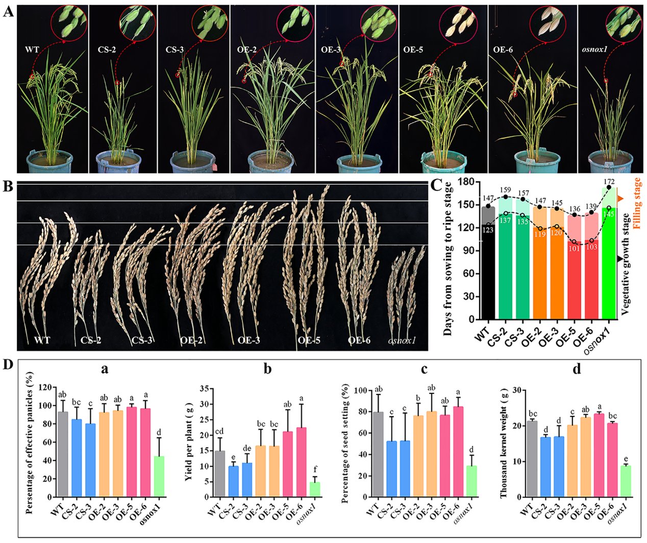图1 TaNOX7过表达是水稻穗增大、产量提高而生育期缩短