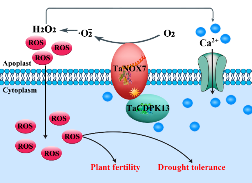 本研究首次在小麦中克隆到了一个NOX家族基因TaNOX7,该基因在小麦幼穗中高量表达,异源过表达导致转基因水稻根增长、ROS释放增加、抗旱性提高、穗增大、产量提高,而生育期缩短。进一步研究发现,TaNOX7能够和一个钙依赖的蛋白激酶TaCDPK13互作,二者均在小麦穗和花器管中高表达并具有一定的共表达关系,瞬时共表达TaNOX7和TaCDPK13能够显著提高烟草叶片的ROS释放水平。这些研究结果表明,TaNOX7和TaCDPK13互作调控ROS的释放,进而协同调节小麦发育与抗旱性。